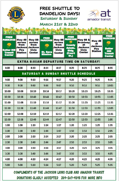 2026 - (Jackson, CA) Downtown Jackson will overflow with family-friendly fun -- antiques and crafts vendors, two days of live music, pancake breakfast, kids’ carnival, food booths, beer and wine garden – at the Jackson Lions Club’s annual Dandelion Days Street Fair, Saturday and Sunday, March 21 – 22, 2026, 8 am – 5 pm, rain or shine.